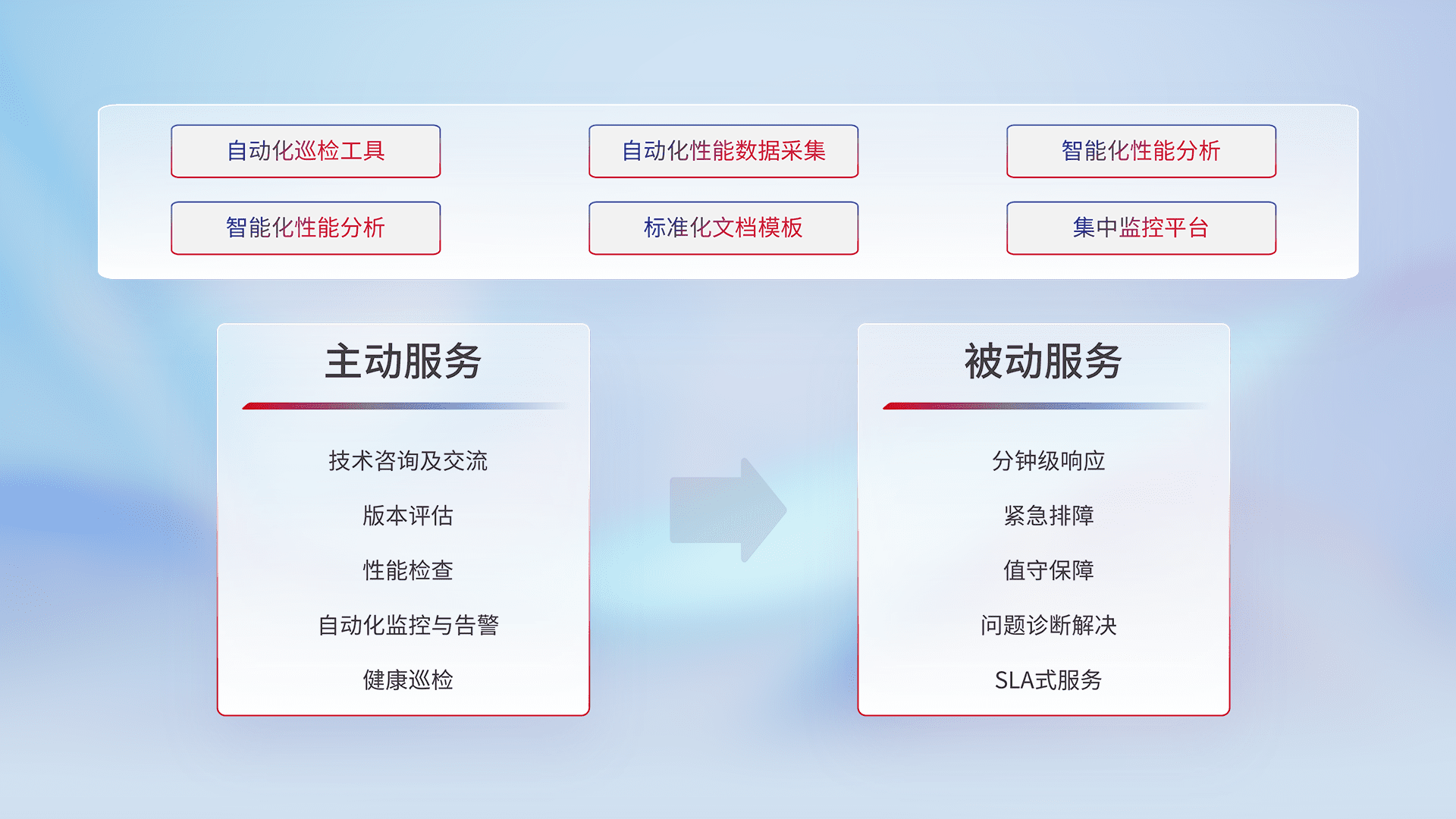 智能化工具和标准化文档,,,,保障服务质量,,提供主动服务(包含技术咨询、、、版本评估、、、性能检查、、、、自动化监控与告警、、、健康巡检)和被动服务包含(分钟级响应、、、紧急排障、、值守保障、、、、问题诊断解决、、、SLA服务)。。。。